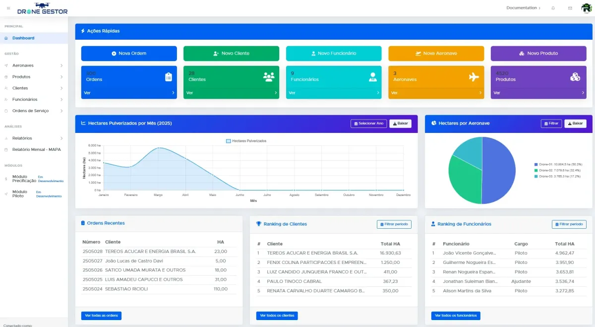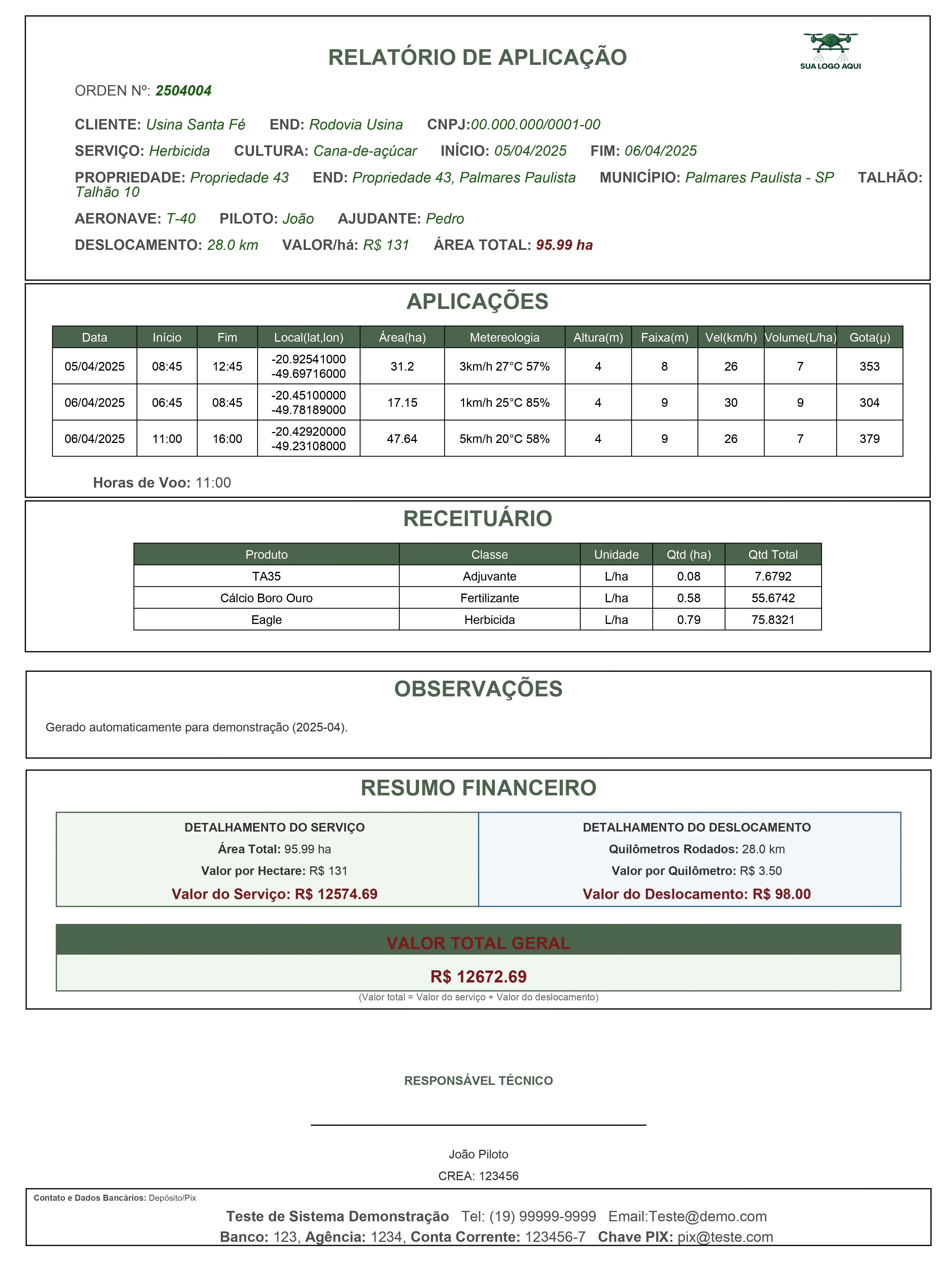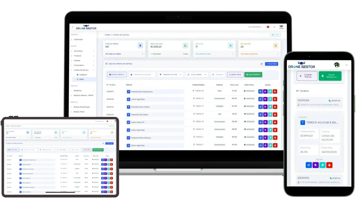Organização Completa: Ordens de serviço, produtos, áreas, clientes, funcionários, aeronaves, receituário agronômico e relatórios por aplicação.