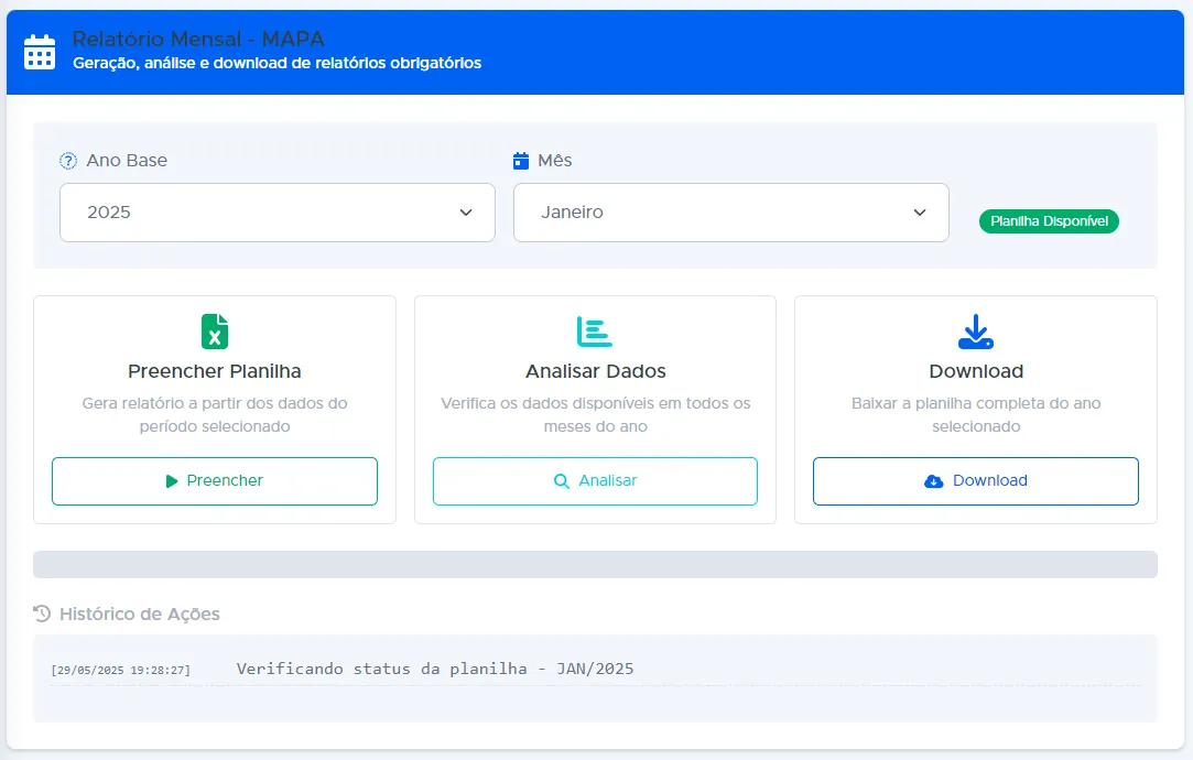 Relatórios Automatizados: Geração automática dos relatórios operacionais e mensais exigidos pelo MAPA.