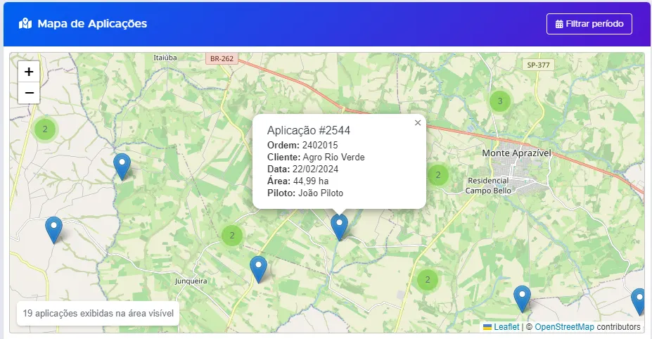 Visualize todas as suas áreas de aplicação em um mapa detalhado. Filtre por cliente, período, planeje novas rotas, identifique áreas de sobreposição e otimize a logística de suas equipes.